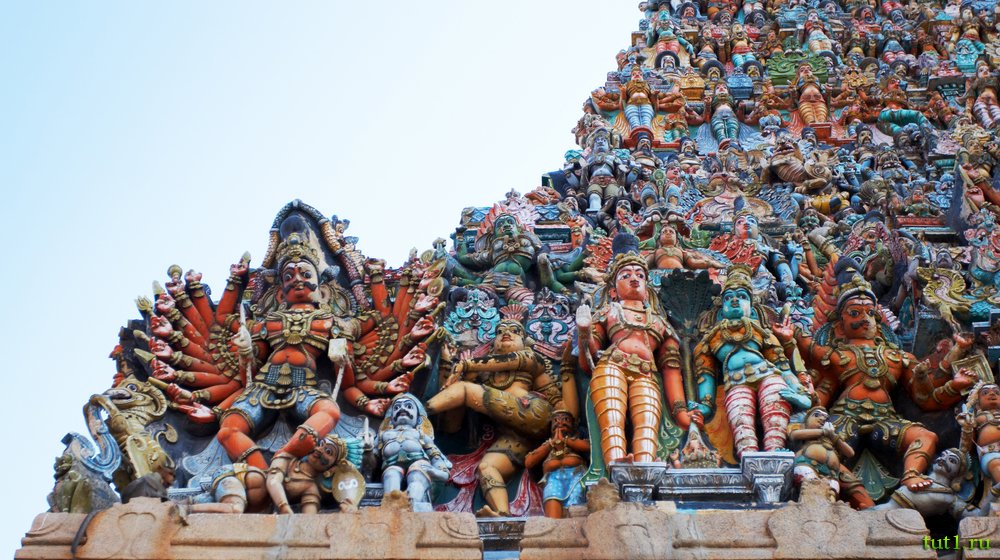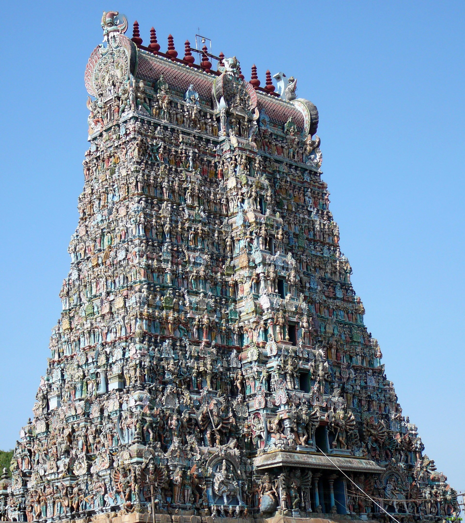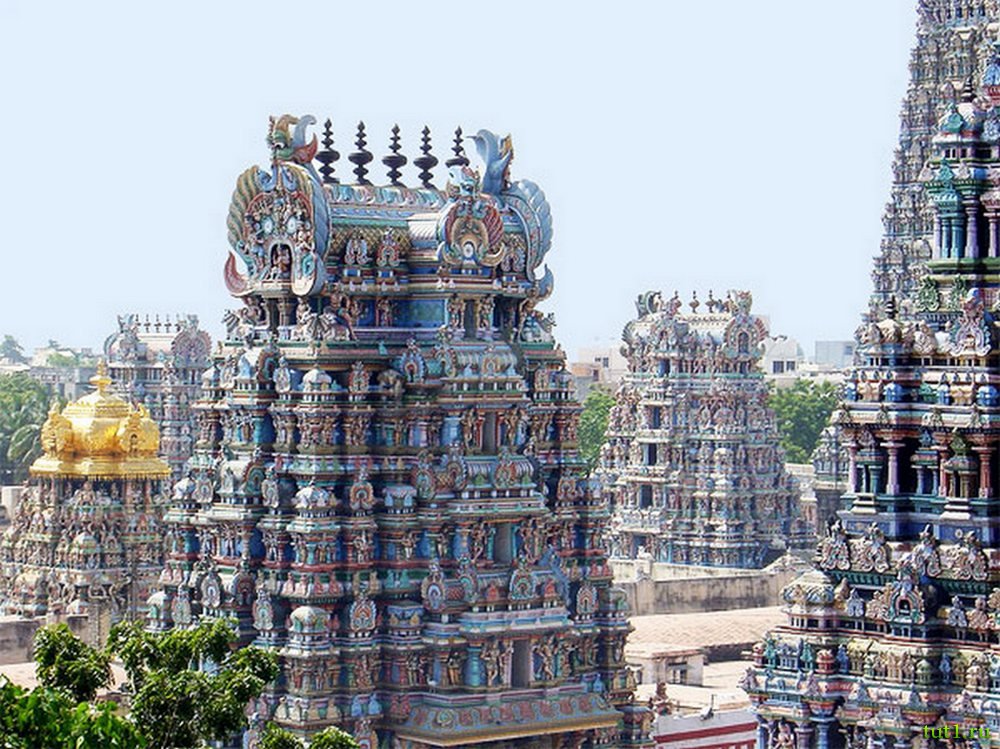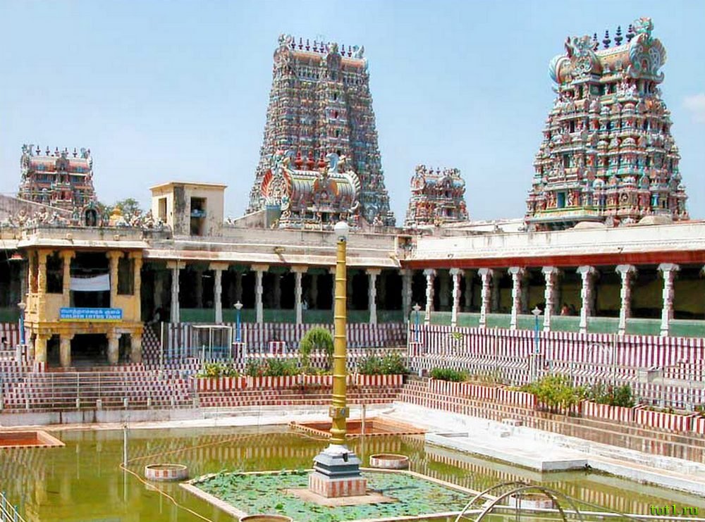 Храм богини Минакши — символ любви Минакши и Шивы. Вокруг главного храма располагаются 14 башен, высота которых достигает 50-ти метров. Все башни и колоны храма усеяны ярко разрисованными скульптурами, ни одна из которых, не повторяется дважды. Сердцем храма считается зал тысячи колон, в центре которого, находится бассейн со святой водой. Не смотря на то, что храму Минакши уже более тысячи лет, он не теряет своей красочности, т.к. его регулярно и тщательно обновляют.