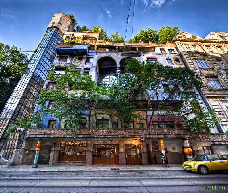 Очень любопытный дом находится в Вене. Дом Хундертвассера "Hundertwasser House" ни на что не похож, он единственный в своём роде. Его автором является знаменитый дизайнер, художник поэт и архитектор — Фриденсрайх Хундертвассер. Хундертвассер одна из самых любопытных фигур в австрийской художественной культeре второй половины XX столетия. Он родился в 1928-м году, а умер в 2000-м году (ему было 72 года). Кем же был Хундертвассер? Не так просто ответить на этот вопрос. Он был дизайнером, фантазером, весьма эксцентричным человеком. Эта эксцентричность начинается с его имени — Фриденсрайх Хундертвассер буквально переводится с немецкого языка так: "свободный мир (Фриденсрайх) сто вод (Хундертвассер)." А вообще его звали не так, его настоящее имя Фридрих Штовассер (Стовассер). Дело в том, что фамилия Стовассер переводится как "стоячая вода" то есть — болото. Не хотел он жить с такой фамилией, он узнал, что по-русски "сто" означает 100, перевел это на немецкий и получилось Хундертвассер. Весьма пышный псевдоним сочинил себе этот человек. Работал он в Австрии, здесь он выдвигал свои идеи, здесь он "сочинял" дома — иначе не скажешь. А потом он уехал в Новую Зеландию и последние годы жизни жил там. Умер этот неординарный человек на пароходе — путешествуя из Новой Зеландии в Европу.