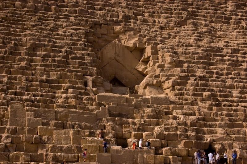 В древние времена пирамида Хеопса была намного величественнее чем сейчас. В то время белая облицовка из белого известняка была на столько тщательно отшлифована, что под солнцем пустыни пирамида сияла словно маяк. Но, из-за крупного землетрясения в 1200-м году н.э. внешняя облицовка обрушилась и упала на землю. Позже их подбирали и использовали при строительстве огромного количества зданий и мечетей в Каире, и сейчас мы можем увидеть лишь несколько таких блоков у основания пирамиды.