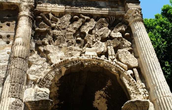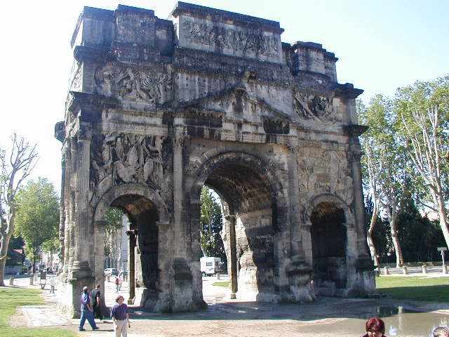 Триумфальная арка Оранжа включает в себя три арки — большую главную, которая расположена по центру, и две меньшие, находящиеся по бокам. Впечатляют размеры арки — её длина равняется 19,5 метров, в ширину она достигает 8,4 метра, а в высоту — 19,2 метра. Главные фасады расположены по направлению на юг и север, а меньшие боковые фасады, соответственно, на запад и восток. Каждый из фасадов украшен четырьмя рефренными коринфским колонами. В 1981-м году триумфальная арка была занесена в список Всемирного культурного и исторического наследия ЮНЕСКО.