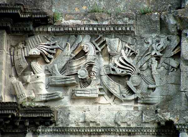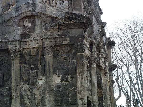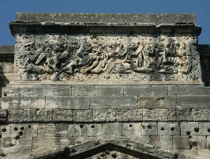 Арка украшена изображениями, отражающими военные темы. На ней присутствует изображение бронзовой колесницы с четырьмя лошадьми, четыре статуи на вершине, изображение галльского сражения на фризе, ниже, с обеих сторон, — трофеи от галльских судов.