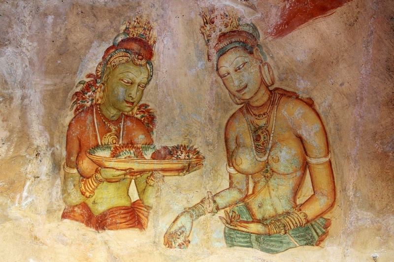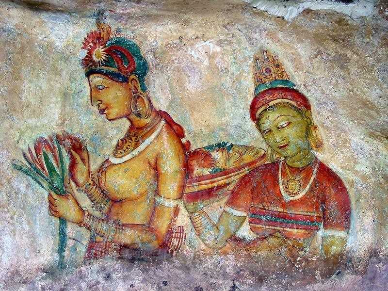 Туристы часто считают Сигирию местом греховных плотских наслаждений — обитатели этого дворца проводили время в удовольствиях и плотских утехах. Становится понятно, почему это место имеет подобную репутацию. На вершину скалы ведет «Пещера небесных дев», где находятся многочисленные фрески. Одна из версий говорит о том, что на фресках изображены наложницы Касапы, потому что у царя был очень обширный гарем. По другой — это изображения богинь, которые якобы спустились с неба чтобы поприветствовать Касапу. По преданию, на стенах этой пещеры (длина которой составляет 40 метров) были изображены 500 прекрасных девушек. «Пещера небесных дев» с фресками Сигирии является самой большой картинной галереей в мире. Однако, до нас дошли неповрежденными лишь 15 изображений: когда Касапа умер, сюда пришли монахи чтобы основать на горе монастырь. Религиозные чувства взыграли против изображений обнаженных девушек и монахи постирали те фрески, до которых смогли дотянуться. Но и тех фресок, что остались достаточно чтобы оценить всю глубину мастерства древних художников. Рассматривая изображения древних красавиц, не перестаешь удивляться тому, как хорошо фрески сохранились за прошедшие 1,5 тысячи лет. Следует отметить особенность этих изображений, намеренно подчеркнутую художником, — у женщин очень узкая талия и пышный бюст.