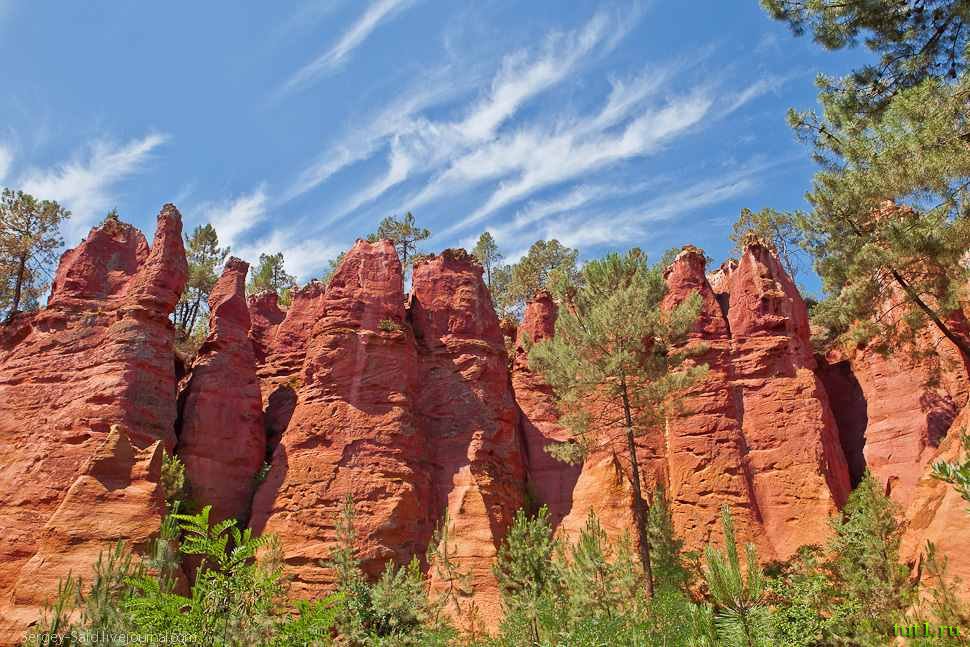 Городок Руссильон еще называют городом охры, или провансальским Колорадо. Охра Руссильона обладает очень богатой цветовой гаммой и достигает 17-ти оттенков от нежно-желтого до кирпичного цвета. В XII веке городом правил Раймонд Авиньонский. Это был крупный мужчина, как в народе говорят — представительный, и очень некрасивый. Зато жена его, по имени Сереймонда, была прелестна. И был у них юный паж-трубадур, которого звали Гийомле Кобистар. Раймонд частенько пропадал на охоте, а между его красавицей-женой и пажом произошло... Ну, Вы наверное догадались. Вот и Раймонд догадался, но виду не подал, а позвал юношу на охоту, где убил его и, вырвав сердце из груди, приказал повару приготовить из него блюдо. "Ну как тебе блюдо?" — за ужином спросил у жены Раймонд. "Я ничего лучше в жизни ни ела", — ответила она. "Не удивительно, ведь ты, моя милая, только что съела сердце своего любовника". Обезумевшая Сереймонда, выскочив из-за стола и выбежав на самую высокую скалу с криком: "Ты прости меня, любимый, за чужое зло" — бросилась вниз. И камни оросились кровью её и с тех пор скалы носят такой цвет.