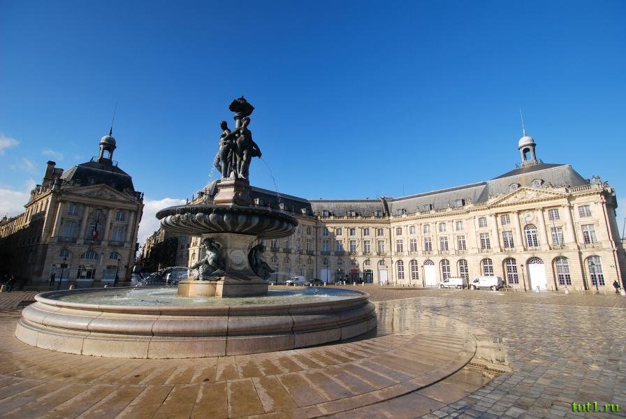 Среди прочих достопримечательностей Бордо стоит отметить Гранд-театр. Он был построен на том месте, где ранее находился римский храм. Фасад театра украшен огромнейшим порталом с колоннами, на котором расположились 12 граций и муз. Вблизи театра расположилась Шахматная эспланада и эспланада Кэнконс — самая большая площадь в Европе, занимающая около 12 гектаров земли. На необыкновенно красивой площади Бурс находится фонтан Трех Граций. Сама же площадь граничит с набережной реки Гаронны.