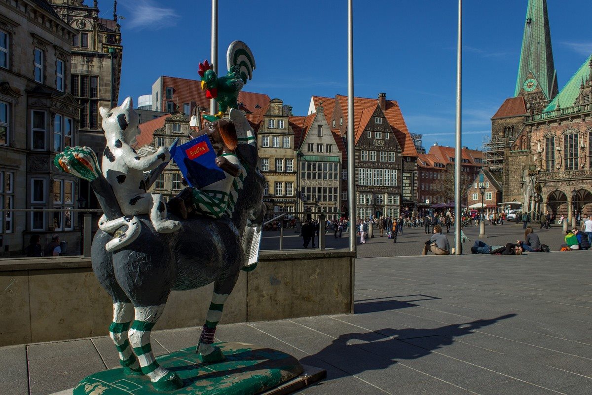 Город Бремен – это нечто из сказок братьев Гримм – авторов знаменитых "Бременских музыкантов". Их скульптурные изображения представлены по всему городу во всех сувенирно-памятниковых видах. В плюшевом, фарфоровом, глиняном, бумажном, пластиковом, бронзовом, гипсовом и еще неизвестно в каком виде. Словом, их миллионы. В какой-то момент может возникнуть ощущение, что Бремен построили исключительно для туристов – количество памятников и благоприятного фона для фотографий здесь по десятку на каждом квадратном метре. Очень большое количество городских скульптур в масштабе – размером с человека.