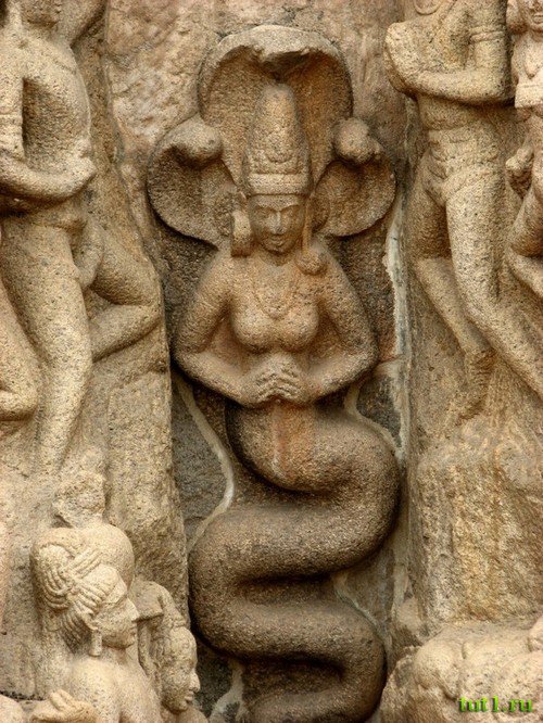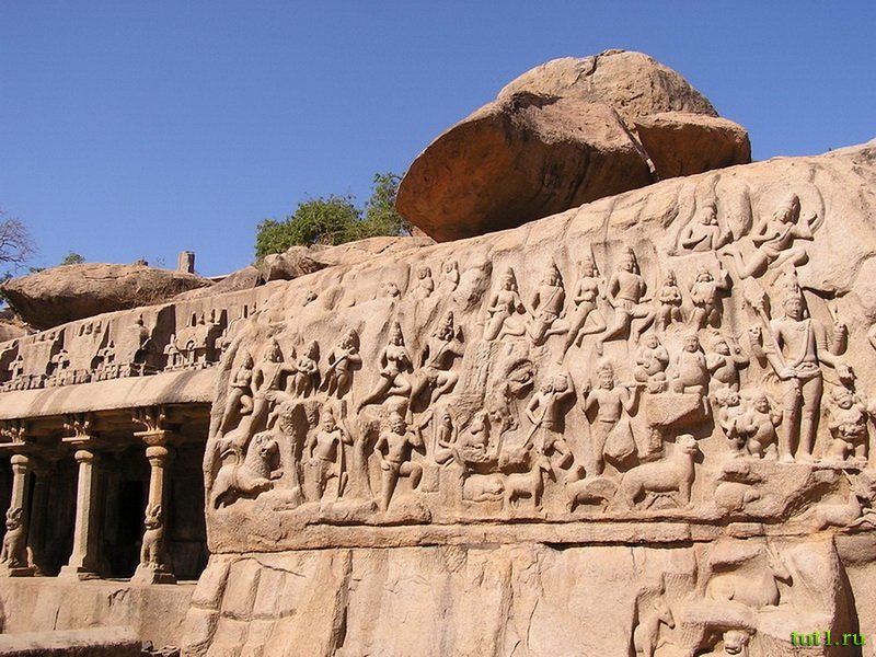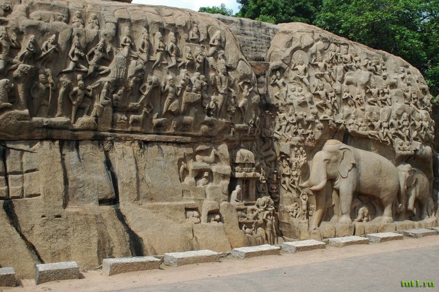"Нисхождение Ганги" считается самым большим в мире барельефом. На этой огромной глыбе, высечены из скалы (размером 27x9 метров) изображения животных, сверхъестественных сил и людей, глядящих на реку. Археологи полагают, что барельеф изображает мудреца Пхагерата, который молился Шиве, чтобы тот пустил воды Ганга по высушенной солнцем земле. Животные, глядящие с этого чуда, нарисованы очень точно.