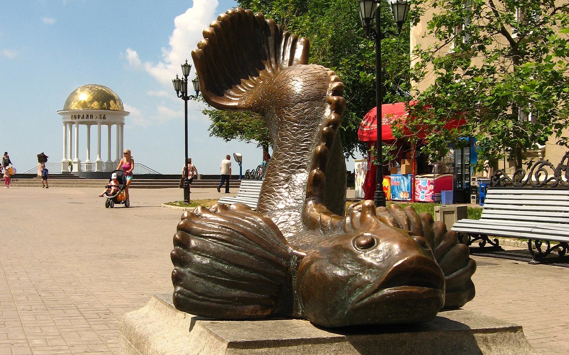 На Приморском бульваре вы встретите визитную карточку города Бердянска - памятник бычку-кормильцу. История гласит, что в послевоенные голодные годы именно бычок из Азовского моря прокормил жителей Бердянска. И до сих пор в любой Бердянской семье вы можете покушать бычка вареного, жареного, сушеного, котлеты из бычка и очень много других блюд.