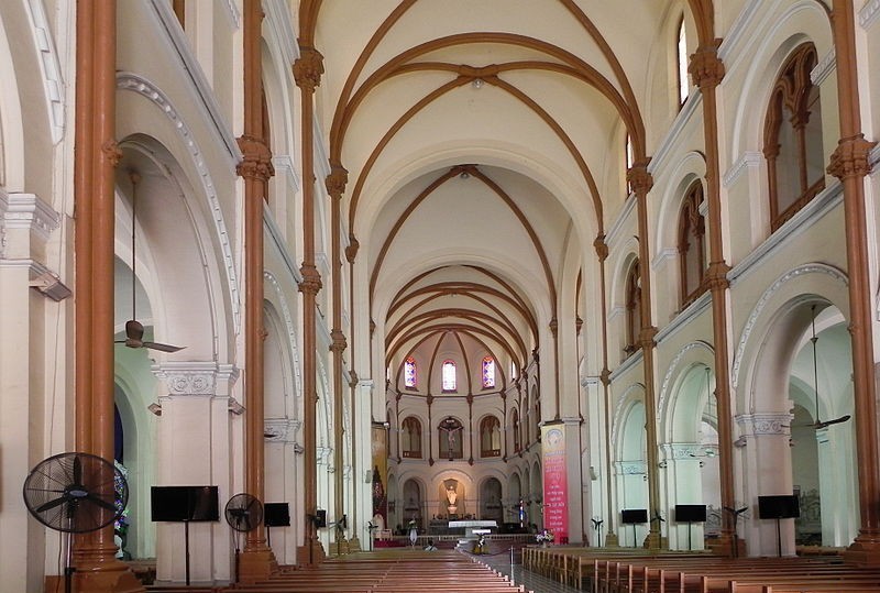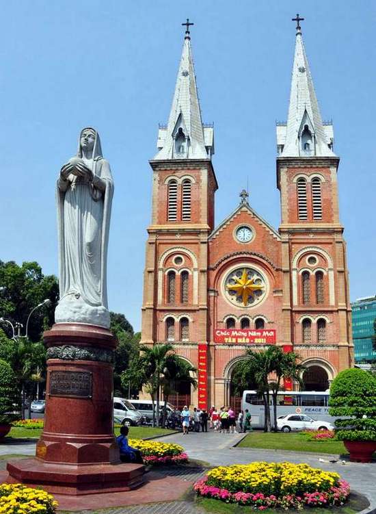 Собор Нотр-Дам в Хошимине был возведен во время французского правления. Сначала построили церковь из дерева (в 1863 году), но через несколько лет она была повреждена нашествием термитов. Тогда решено было возвести христианский собор, который бы затмил все буддийские храмы. При строительстве местные материалы не использовались, а завозились из Европы. Из Марселя был привезен красный кирпич, а из Шартра — прекрасные витражи (большая часть из-за войны была уничтожена). Проект собора принадлежит французскому зодчему (J. Bourad). На возведение храма ушло шесть лет — его возводили с 1877-го по 1883 год. Первоначально его называли Церковью Сайгона, но в 1959 году епископ Фам Ван Тхиен дал собору название Нотр-Дам. В это же время в храме была установлена сделанная из римского гранита статуя. А в 1962 году Ватиканом была произведена церемония помазания и собору даровали звание Базилика.