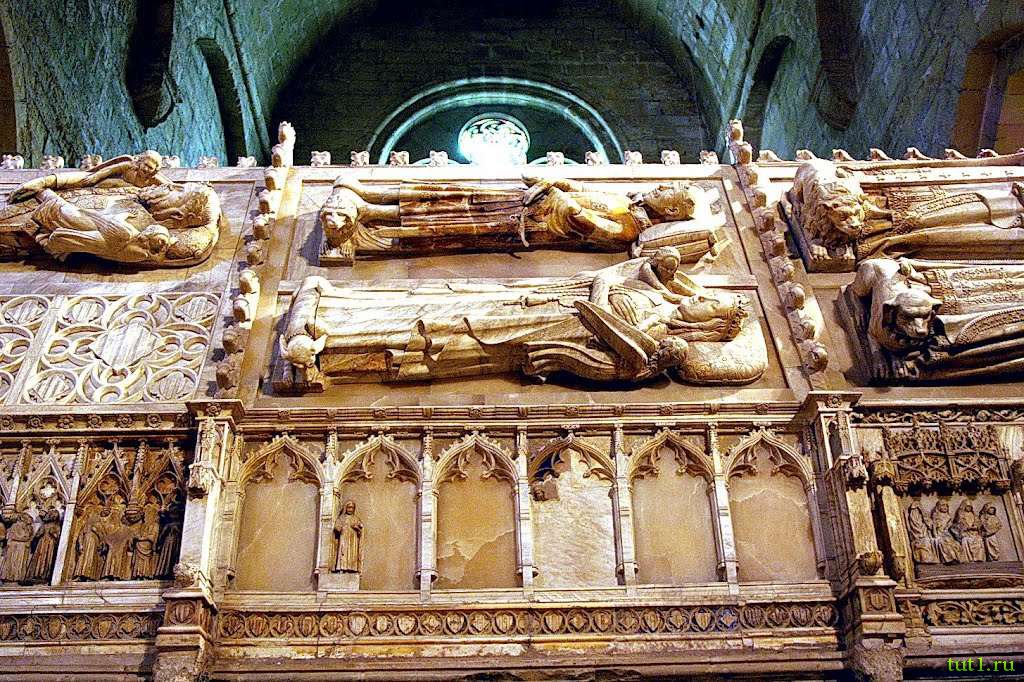 Единственное пышно-украшенное место в монастыре Поблет это склеп, где захоронены графы Барселоны и короли Арагона. Причем первое захоронение относится к 1359-му году. Впечатляющее захоронение этих знатных семейств выполнены в мраморе.
