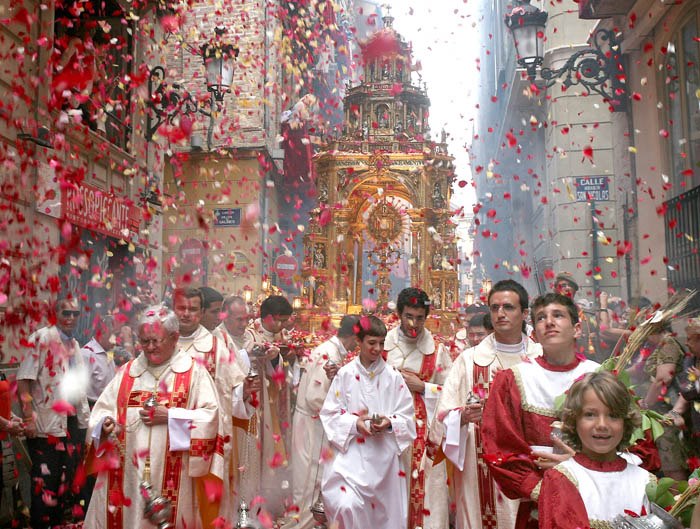 Красивые традиции: во время процессии разбрасывались лепестки цветов, священную ткань сопровождал эскорт вооруженных солдат и кортеж из знаменитых горожан — предводители дворянства, знатные семьи, феодалы, купцы и другие. Неотъемлемой частью праздника являются цветочные ковры, о которых можно подробнее узнать в статье «Цветочный ковер на празднике Тела Христова».