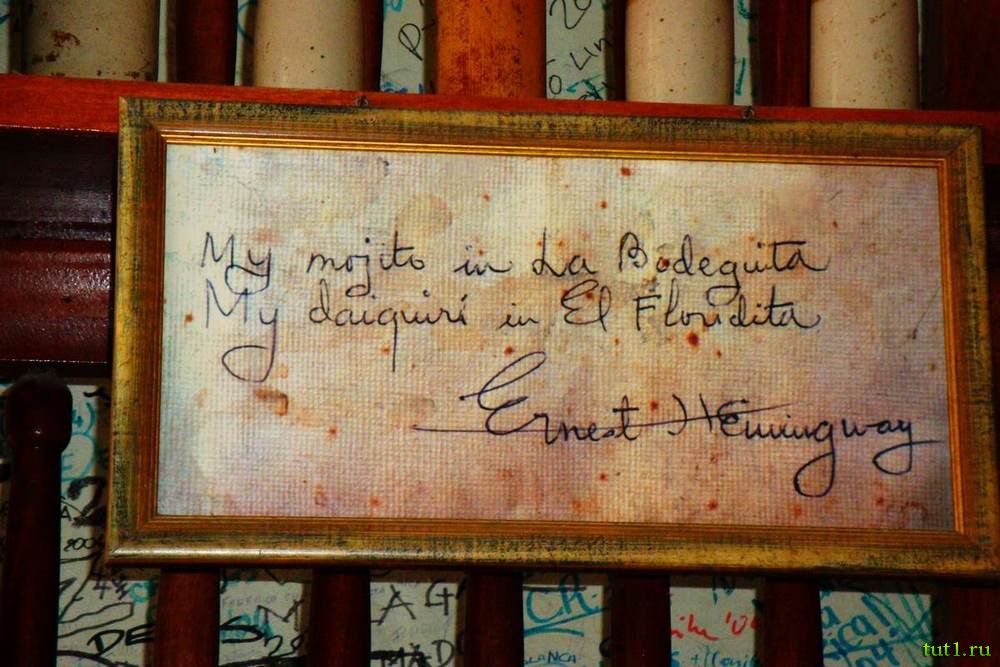Имя Эрнеста Хемингуэя тесно связано с Кубой так же как и имена Колумба или Че Гевары. Американский писатель, лауреат Нобелевской премии, жил на Кубе в течении 20-ти лет, начиная с 1939-го года. Впервые он посетил эти места в 1928-м году и каждый раз останавливался в 511 номере отеля Ambos Mundos в старой части Гаваны. Благодаря ему, два бара под названием La Bodeguita del Medio и Floridita стали известны на весь мир.