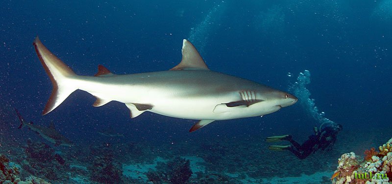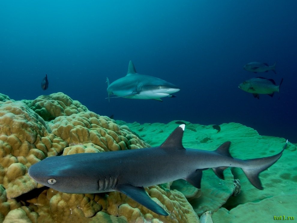 Стая барракуд привлекает внимание серой рифовой акулы. Эти акулы оставляют незабываемые впечатления у всех, кому удается с ними встретиться. Не смотря на о, что это очень активные и любознательные животные, они не атакуют ныряльщиков без повода. Привлеченные изобилием животных, населяющих риф, эти акулы приплывают сюда поохотится на рыб, моллюсков, осьминогов и ракообразных — креветок и крабов.