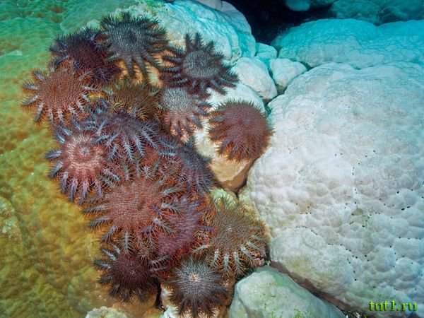 С точки зрения кораллов, больше всего им угрожает один страшный хищник — морская звезда терновый венец. Количество этих хищников необычайно возросло в 70-х годах. Точно неясно, что стало тому причиной, но учёные выдвигают разные теории.
