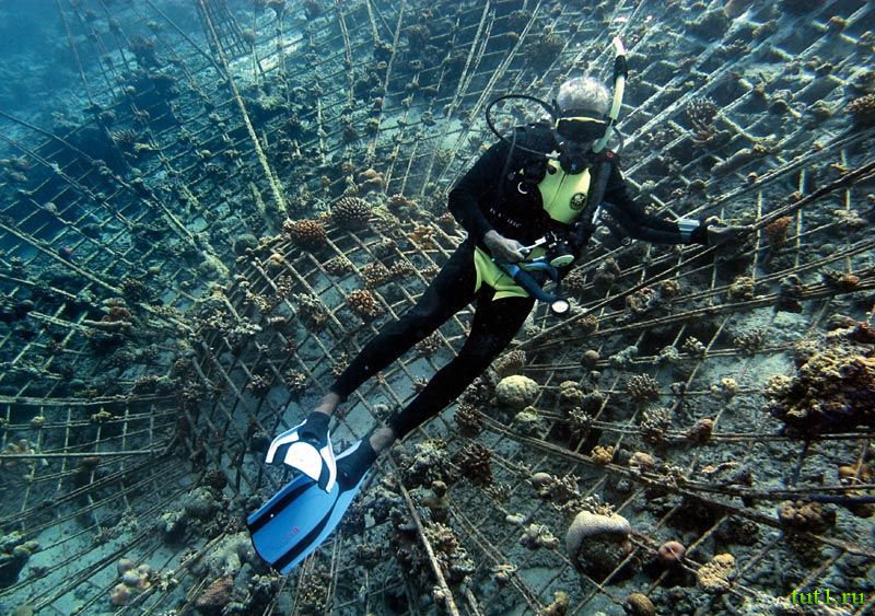 На металлические рамы поселили личинок кораллов, которые начали разрастаться и постепенно обволакивать их своим кальциевым скелетом. Теперь, среди этих искусственных рифов проживают самые разнообразные морские существа.