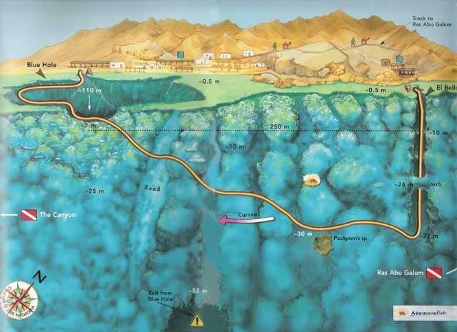 В Египте есть уникальное место, где красота приобретает космическое звучание. На побережье Красного моря севернее Дахаба находится Голубая дыра (Blue Hole) — одно из лучших мест на Синае и опаснейшее место для дайверов. Голубая дыра представляет собой вертикальную пещеру, уходящую в глубину Красного моря на 100 метров, окруженную коралловыми рифами. Как образовалась эта отвесная пещера, диаметром не менее 50 метров, геологи точно объяснить не могут.