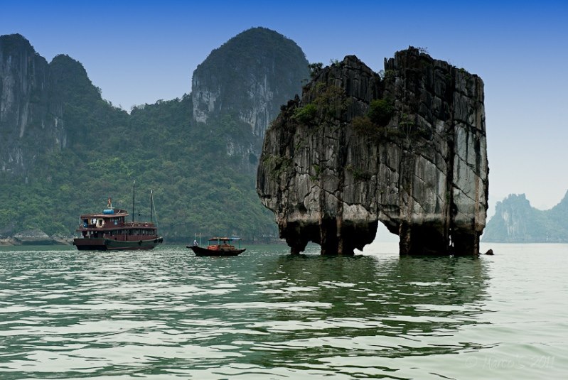 На площадь Халонга приходится порядка 1 500 квадратных километров. Его территория богата пещерами, скалами и утесами, а островов ученые насчитали более 3-х тысяч. Что же ожидает туристов в загадочной бухте Халонг? Помимо причудливых зеленых островков, достопримечательностями залива являются скалы с башенным карстом. Внутренние образования сформировались в них под воздействием дождевых вод, размывавших известняк десятилетиями.