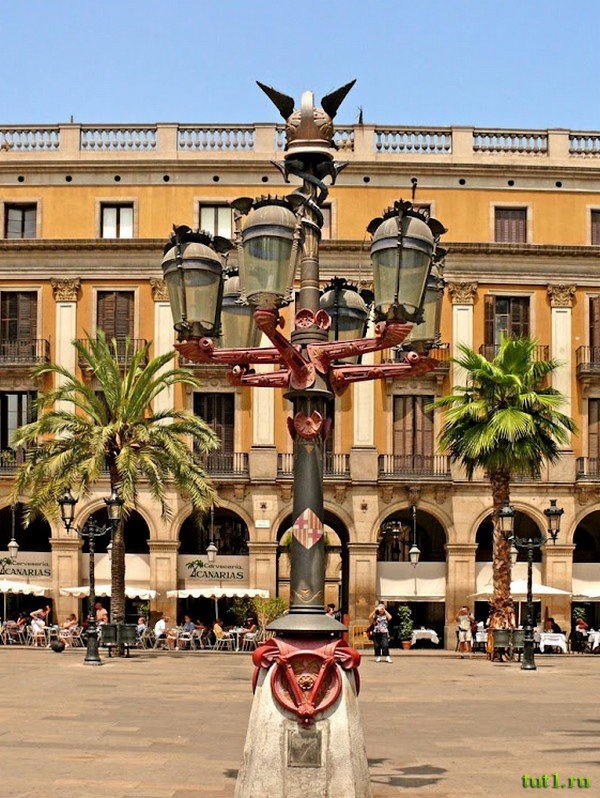 Изюминкой площади Plaza Real являются фонари, которые были установлены здесь в 1878-м году. Фонари в классическом стиле были созданы, еще совсем молодым, Антонио Гауди. Именно эти фонари стали его первым известным творением.