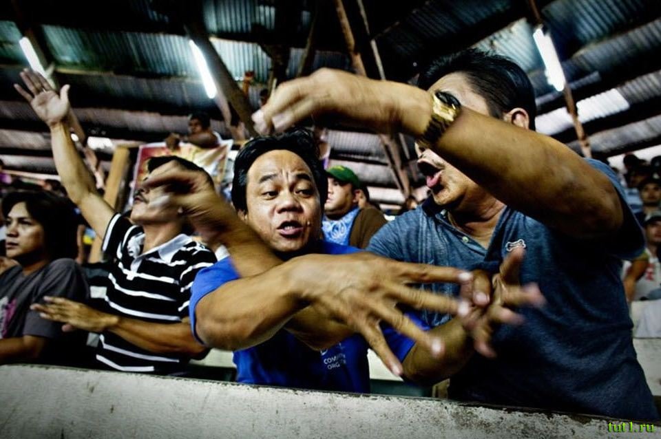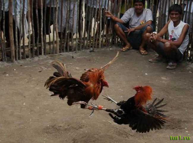 На Филиппинах петушиные бои это национальный вид спорта — как бейсбол в Америке или футбол в Европе. В бои вкладываются такие огромные денежные средства, что правительство не решается вмешиваться — это может стоить им на выборах слишком многих голосов. На Филиппинах очень мало борцов за права животных и вряд ли к их голосам всерьез прислушиваются. Конечно, есть организации, борющиеся за права животных, но их мало кто слушает, да и правительство ничего не может поделать, ведь петушиные бои уже стали частью филиппинской культуры. Когда-то петушиные бои были популярны во всем мире. Даже американские президенты Томас Джеферсон и Джордж Вашингтон были их поклонниками.